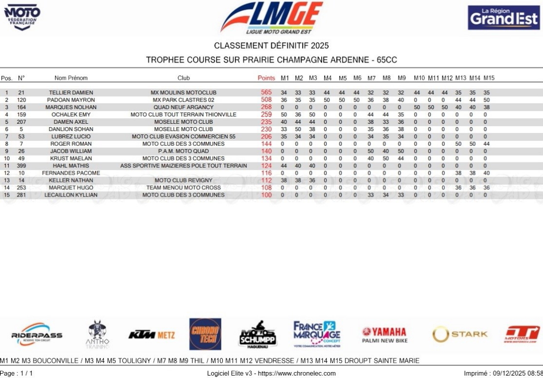 CLASSEMENTS DES CHAMPIONNATS DE CHAMPAGNE