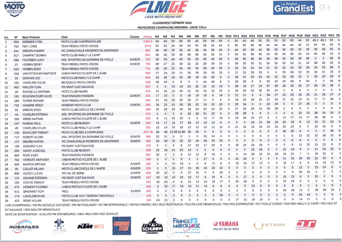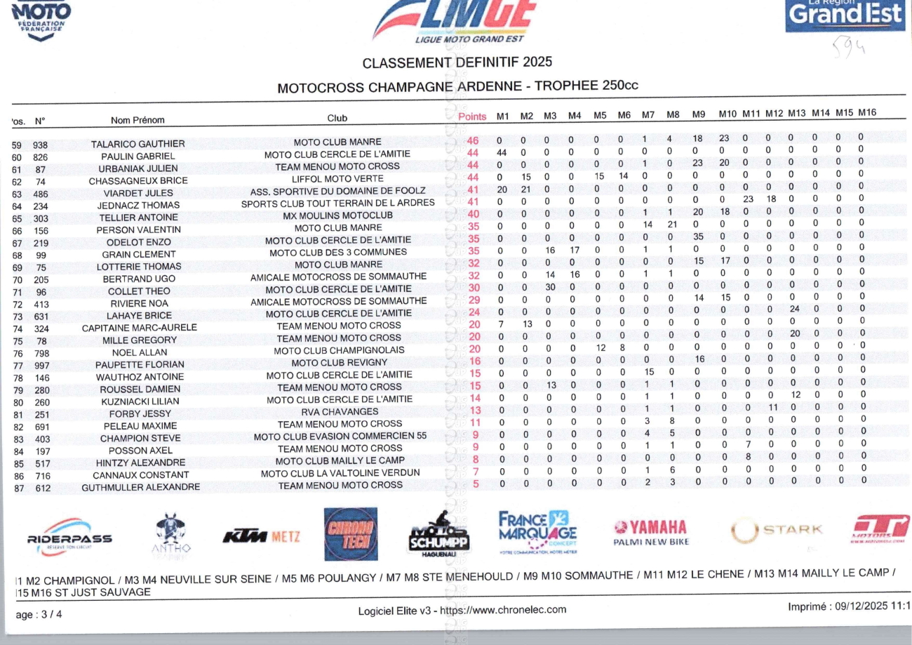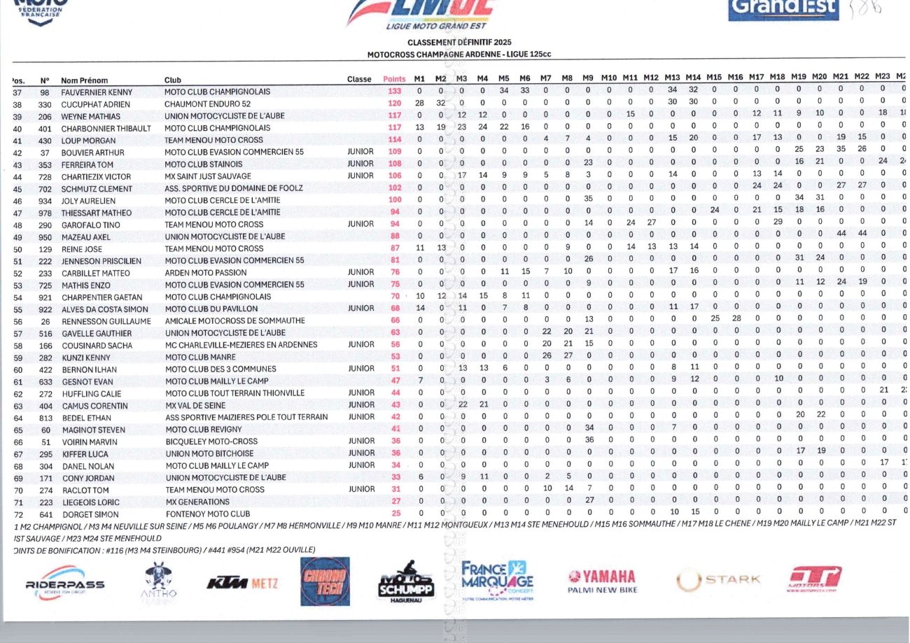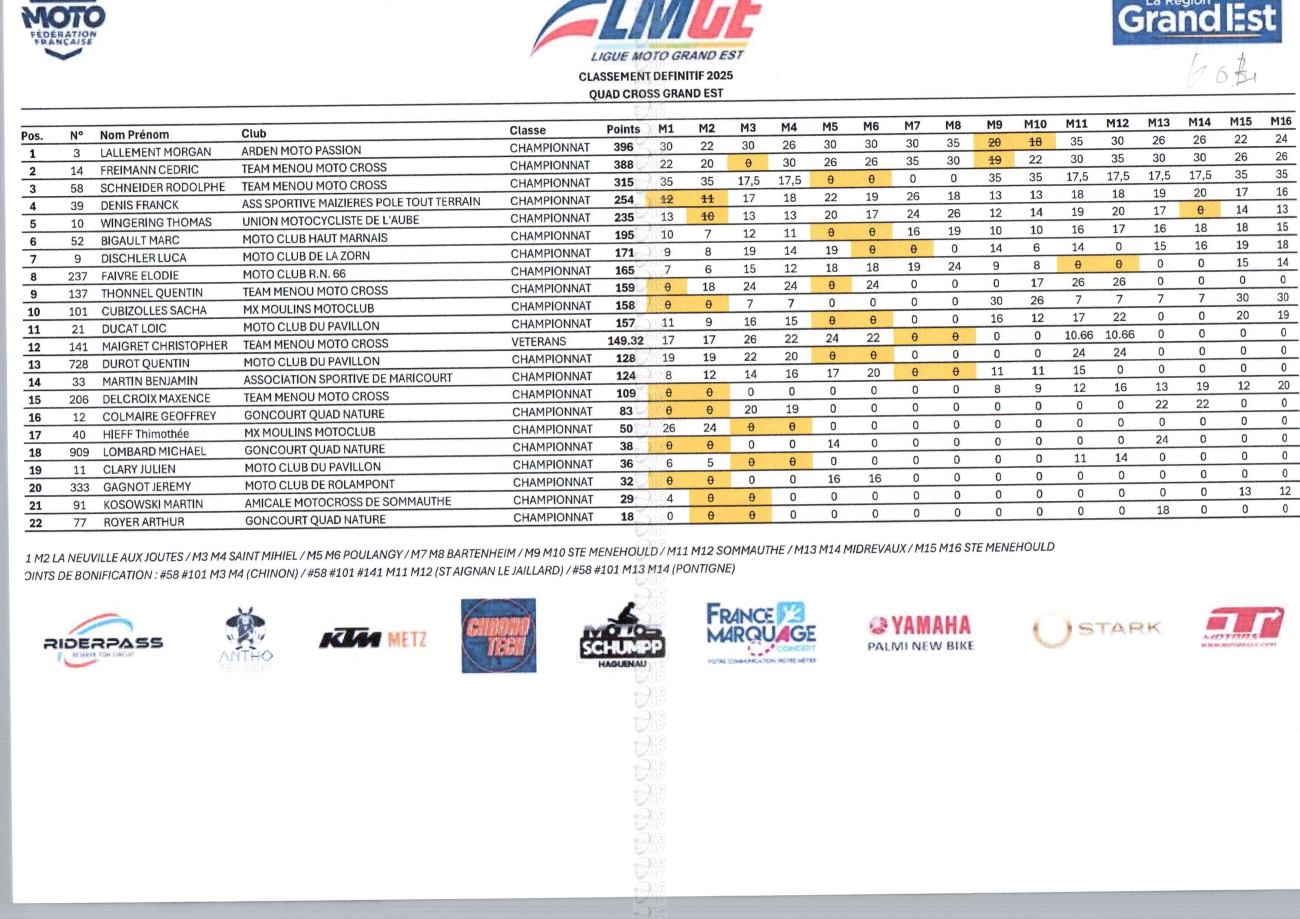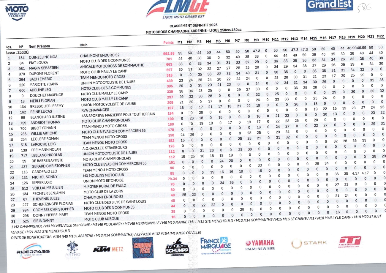 CLASSEMENTS DES CHAMPIONNATS DE CHAMPAGNE