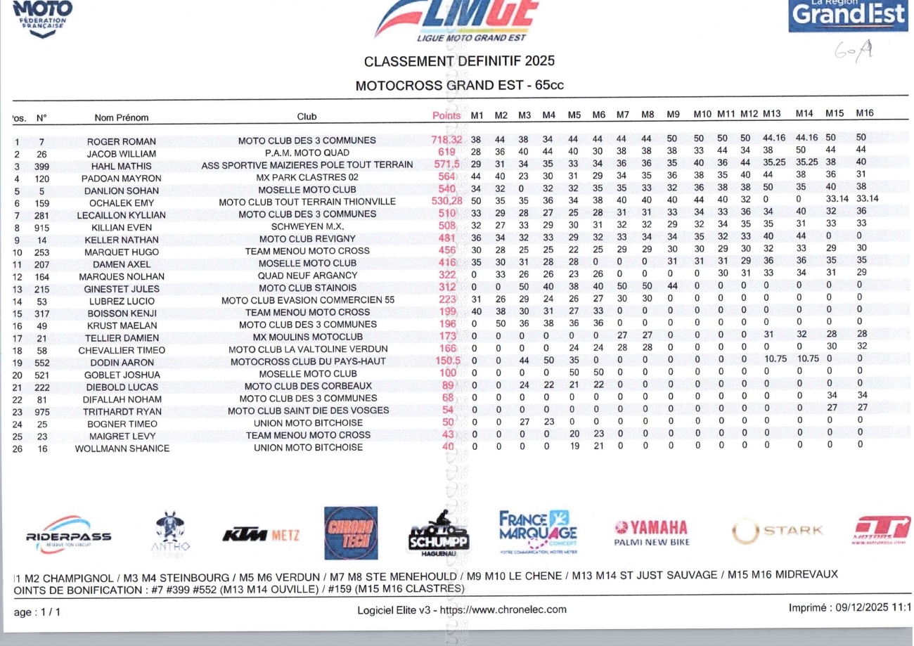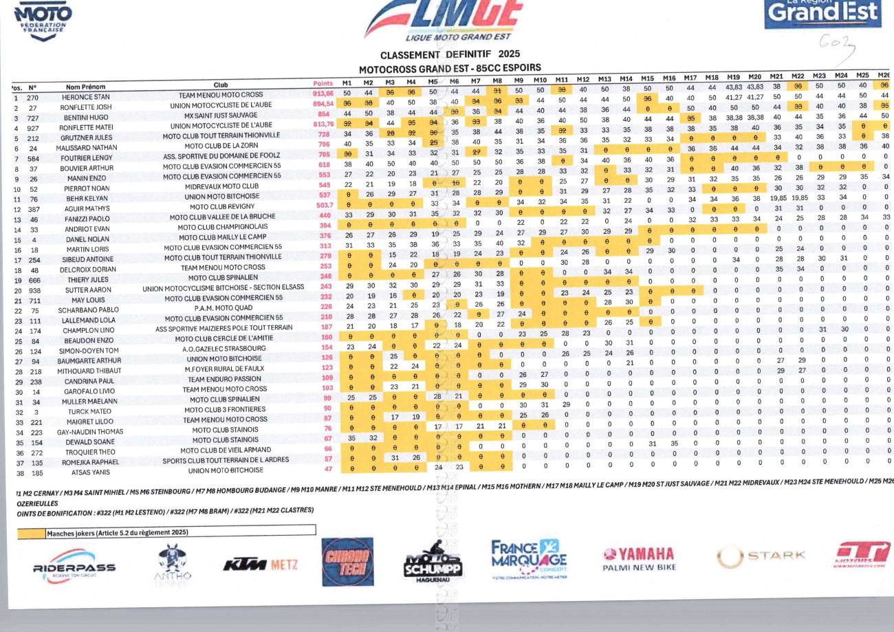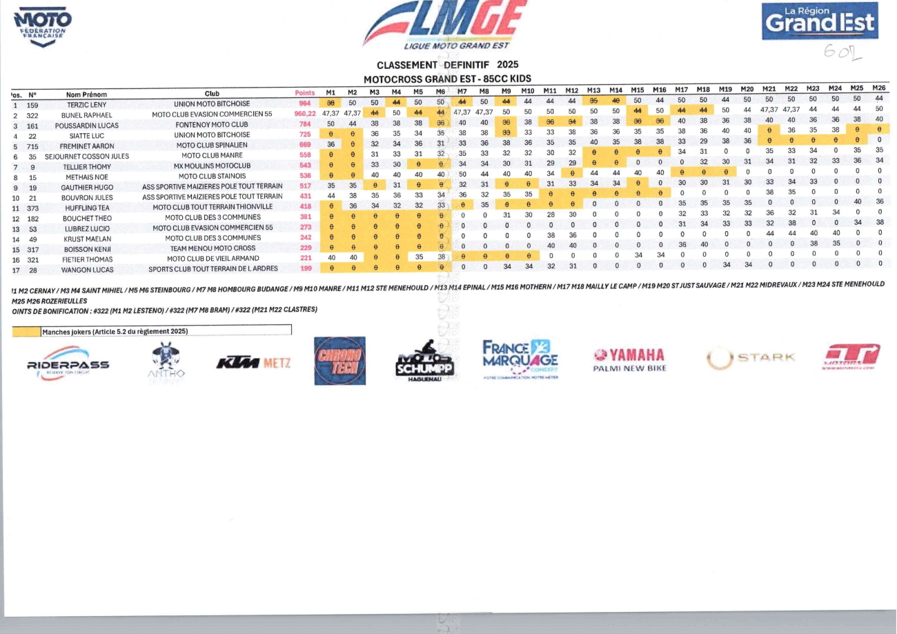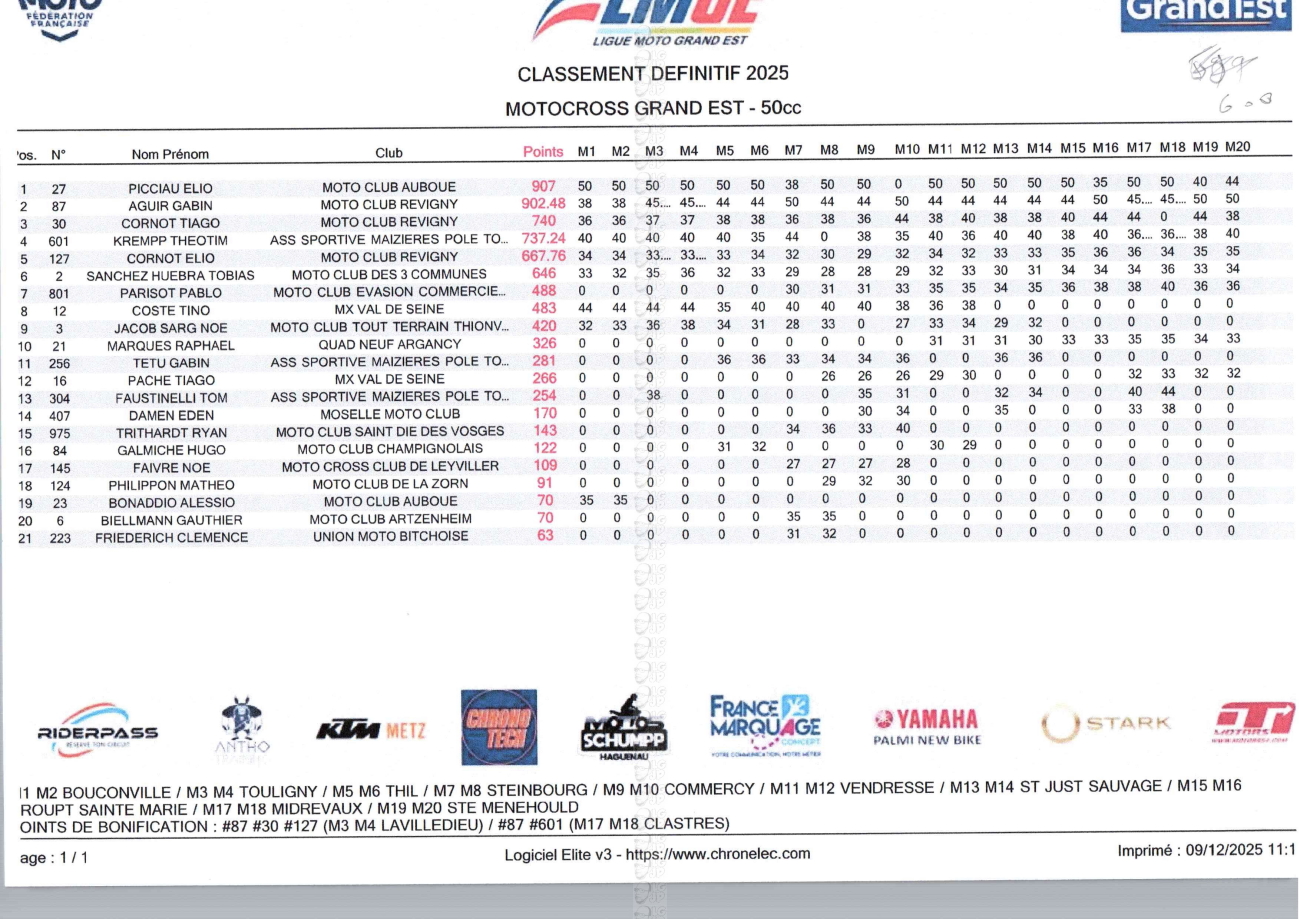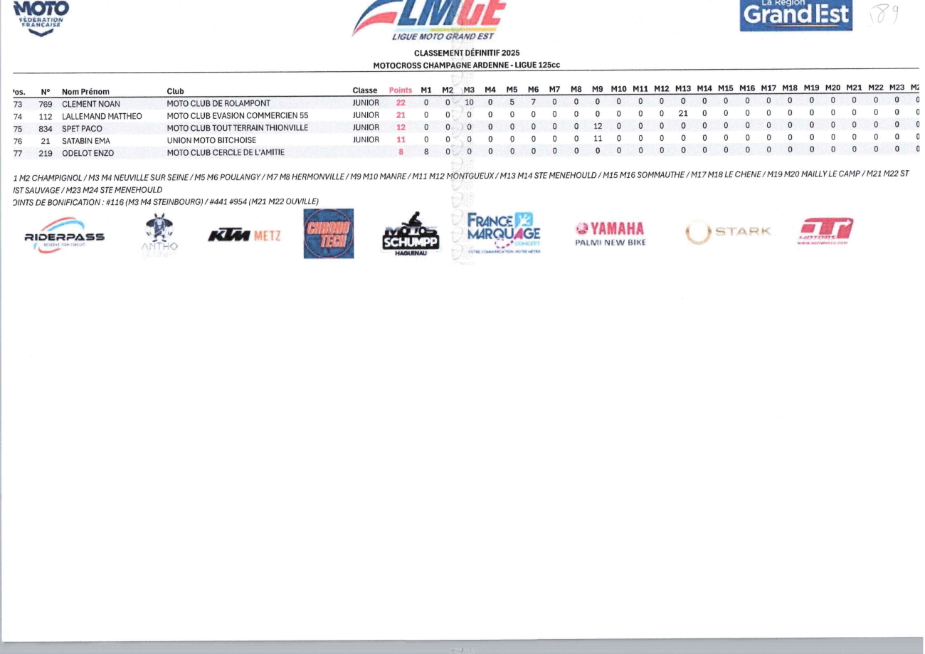 CLASSEMENTS DES CHAMPIONNATS DE CHAMPAGNE